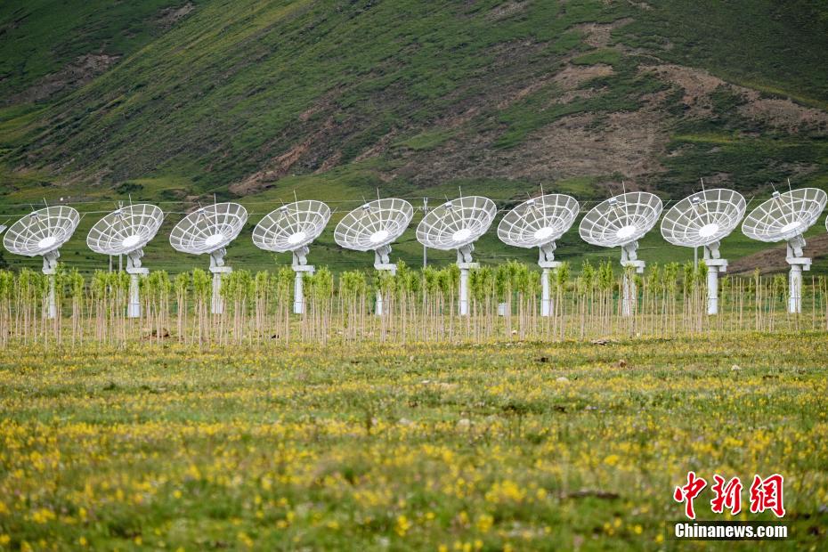 7月22日,四川稻城縣,草原花海中的天線矩陣。中新社記者 劉忠俊 攝