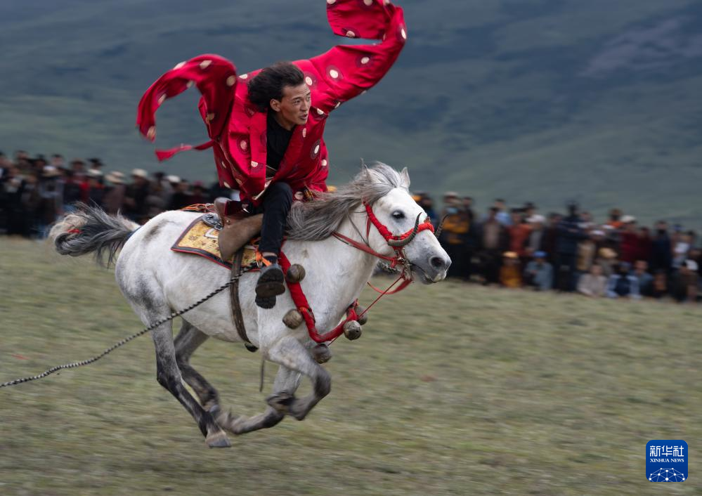 7月30日,在理塘縣多旺塘賽馬場,一名康巴漢子展示五彩凌空。新華社記者 江宏景 攝