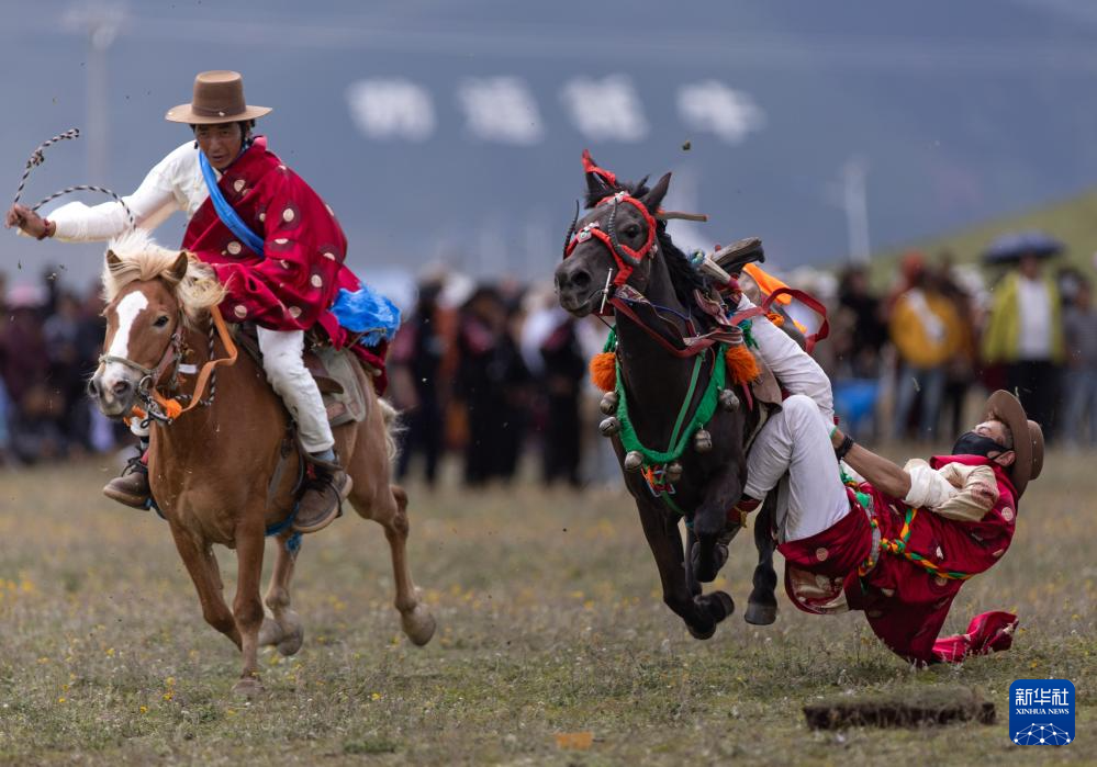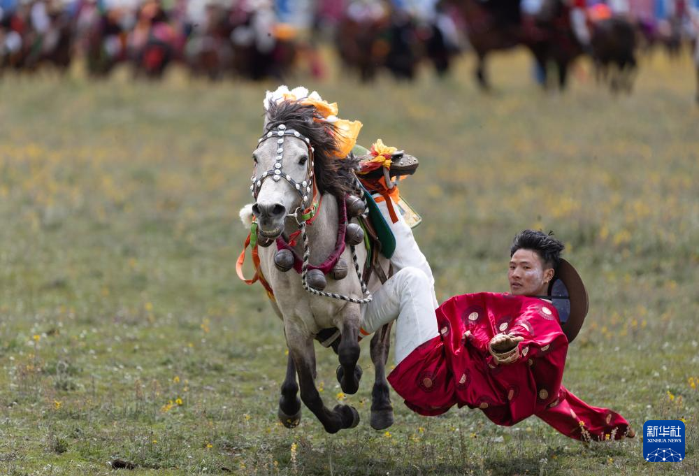 7月30日,四川省甘孜藏族自治州理塘“八一”賽馬會在多旺塘賽馬場啟幕,來自全縣各鄉(xiāng)鎮(zhèn)近千名牧民匯聚一堂。賽馬會上表演的拾哈達、馬上射擊、馬上射箭、鐙里藏身、五彩凌空等馬術(shù)絕技,讓當?shù)啬撩窈陀慰拖硎芰艘粓鲆曈X盛宴。
