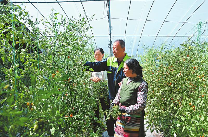 在瑪吉阿米花園農(nóng)莊的大棚內(nèi),山東壽光來的劉振國(中)在指導(dǎo)栽培技術(shù)。四川日報(bào)全媒體記者 肖雨楊 攝