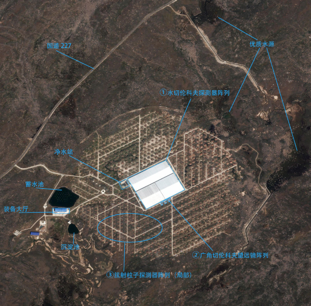 “拉索”占地面積約1.36平方公里,由地面簇射粒子探測器陣列(包含5216個電磁粒子探測器和1188個繆子探測器)、水切倫科夫探測器陣列(面積約78000平方米)和廣角切倫科夫望遠鏡陣列(18臺)組成,采用四種探測技術,可全方位、多變量測量來自高能天體的伽馬射線和宇宙線。