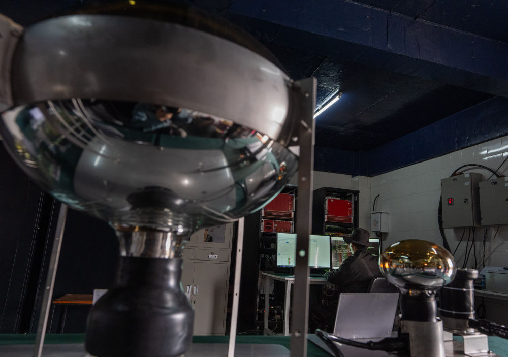 9月20日,“拉索”工作人員在一臺廣角切倫科夫望遠鏡上檢查成像部件。新華社記者 金立旺 攝