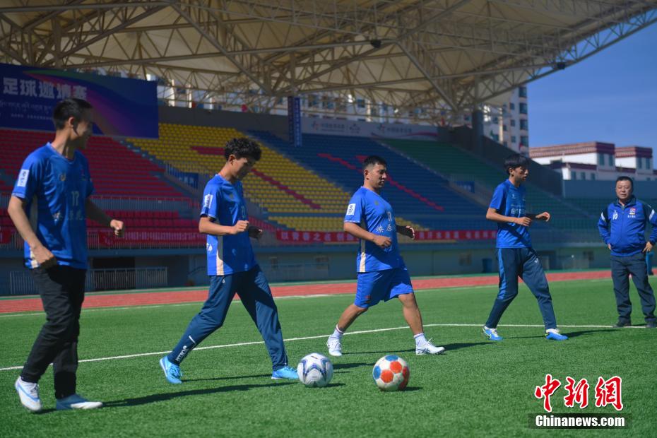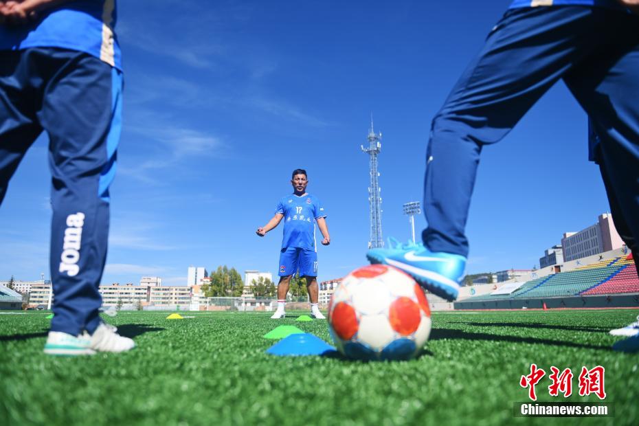 10月15日,在甘肅省甘南藏族自治州合作市一足球場(chǎng)內(nèi),甘南九二聯(lián)隊(duì)隊(duì)長(zhǎng)久西道杰指導(dǎo)球員球技。
