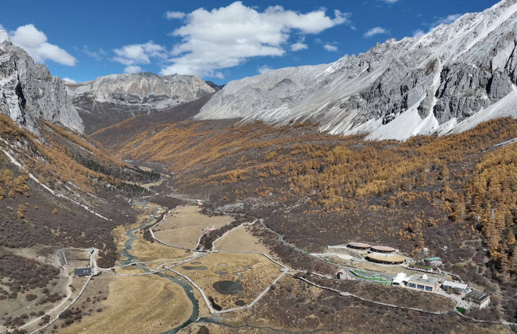 深秋的亞丁五彩斑斕,湛藍的天空下山谷秋葉繽紛、層林盡染,萬年的皚皚雪山與千年的蔚藍海子遙相呼應(yīng),黑色的牦牛多如繁星般點綴在金黃的草甸之上。漫步在洛絨牛場,幾條蜿蜒的小溪宛如一條條絲帶飄繞在草原上。仰頭環(huán)視,藏族群眾心中的三座“神山”呈“品”字形矗立在遠處,守護著這片絕美凈土。