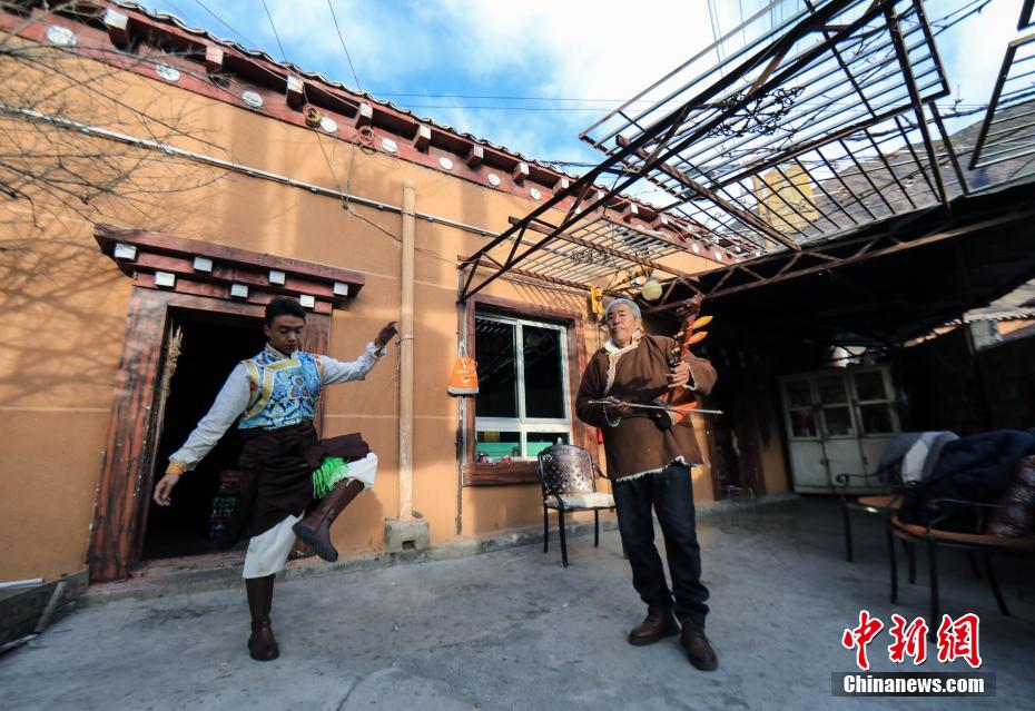 12月21日,四川巴塘,王扎西(右)在自家院中彈奏弦胡,學員降擁朗加在一旁跳起巴塘弦子舞。中新社記者 薛蒂 攝