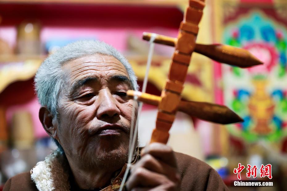12月21日,四川巴塘,在弦胡制作坊里,王扎西為新制作的弦胡上琴弦。中新社記者 薛蒂 攝