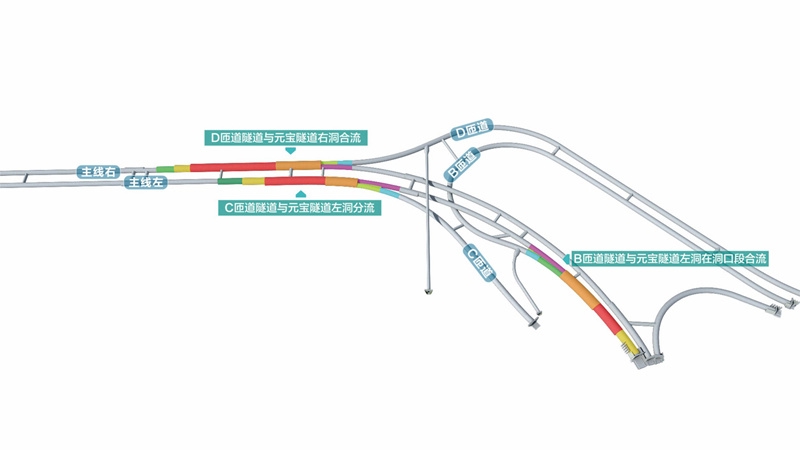 最大的挑戰(zhàn)之一是隧道交疊。在元寶樞紐地下互通中,B匝道隧道與主線元寶隧道左右洞上下交叉,共有三個(gè)交叉影響段落,分別是95米、70米、50米,上下隧道垂直高差最短處僅為33厘米,相當(dāng)于上下兩條隧道幾乎緊緊挨在一起,而兩條隧道總開挖高度又接近21米,相當(dāng)于7層樓高?!霸谒淼郎显傩匏淼?,稍有不慎就可能引發(fā)垮塌等事故。”廖志宣說(shuō),交疊隧道的部分還未施工,因?yàn)轫?xiàng)目是世界之最,可供參考的案例很少,目前正和科研團(tuán)隊(duì)一起,研究系統(tǒng)化的技術(shù)解決方案,為山區(qū)大型地下互通建設(shè)探路。