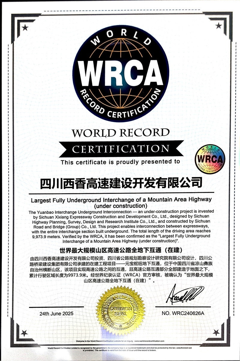 日前,西香高速公路元寶樞紐地下互通,被WRCA(世界紀(jì)錄認(rèn)證公司/機(jī)構(gòu))認(rèn)證為“世界最大規(guī)模山區(qū)高速公路全地下互通(在建)”。WRCA是全球包括中國(guó)唯一獲批相關(guān)世界紀(jì)錄認(rèn)證商標(biāo)的機(jī)構(gòu)。