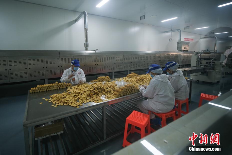 圖為7月28日,洛隆洛宗特色產(chǎn)品開(kāi)發(fā)公司工人包裝青稞餅干。中新社記者 何蓬磊 攝