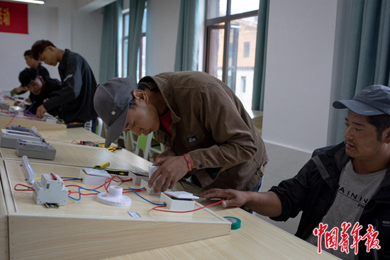 29歲的扎西才登(右二)在電工教室練習(xí)線路組裝。他的家庭是貧困戶,他因聽力障礙,沒有外出打工。村里介紹他來林芝市技工學(xué)校學(xué)習(xí),學(xué)成后可以推薦進(jìn)入企業(yè)就業(yè)。中青報(bào)·中青網(wǎng)記者 李雋輝 攝