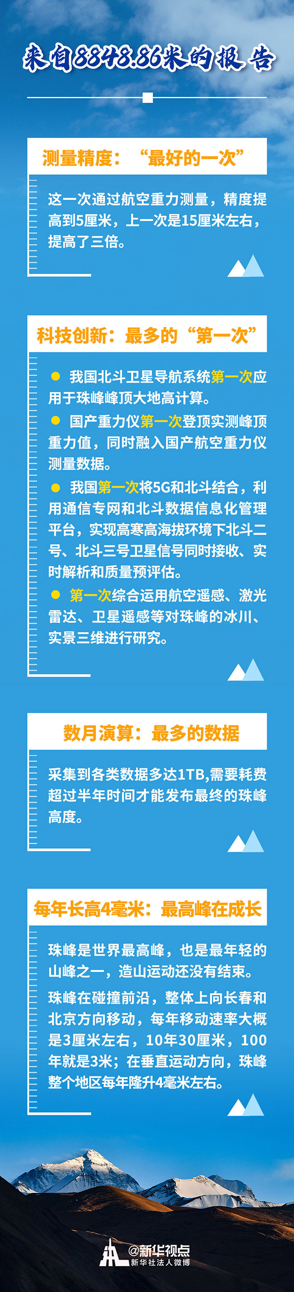 8848.86米:作為世界最高峰的珠穆朗瑪峰最新“身高”8日公布。自然資源部權威人士說,同上一次測量結果相比,此次測量數據的科學性、可靠性、創(chuàng)新性,都達到一個新高度。