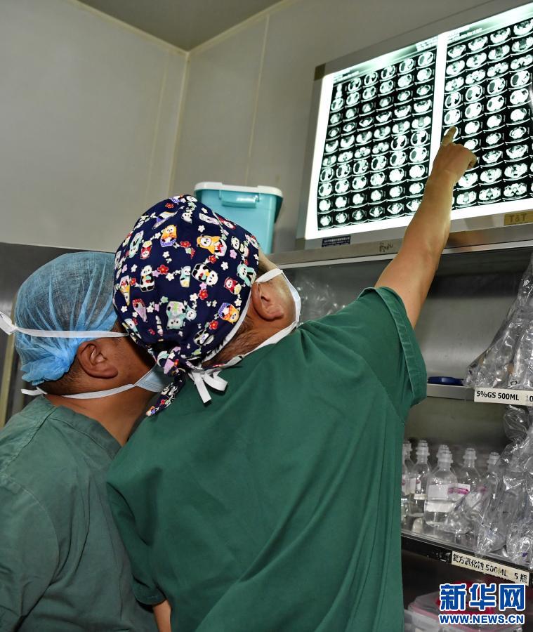 在拉薩市人民醫(yī)院第二手術(shù)室,兩位醫(yī)生在術(shù)前仔細(xì)觀察包蟲病患者的CT檢查圖像(2020年12月31日攝)。新華社記者 張汝鋒 攝
