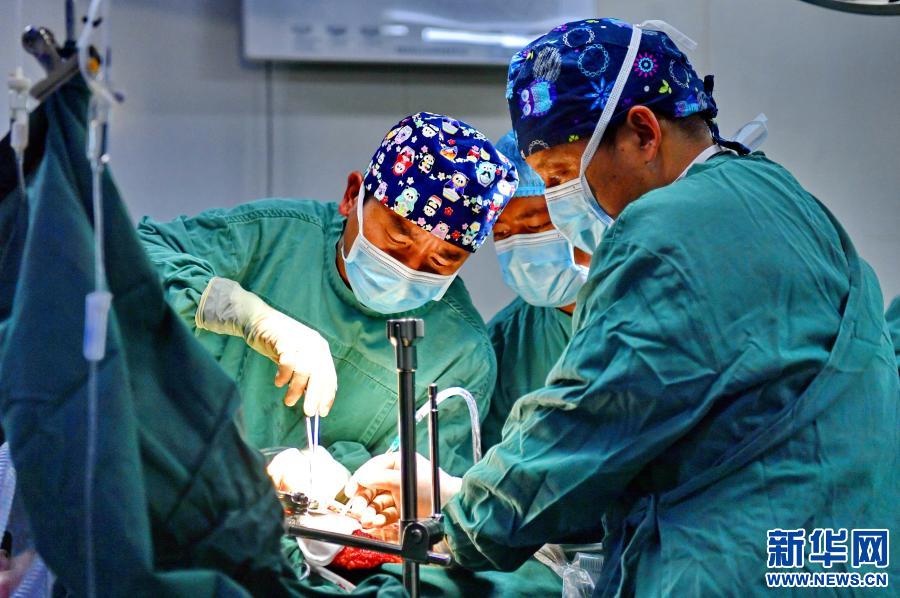 在拉薩市人民醫(yī)院第二手術(shù)室,主治醫(yī)師醫(yī)生扎西云旦(右)在和同事為包蟲病患者做手術(shù)(2020年12月31日攝)。新華社記者 張汝鋒 攝