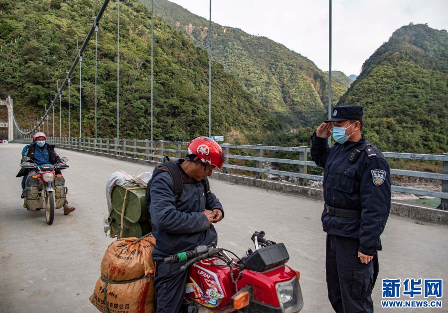 在三代解放大橋上,西藏林芝邊境管理支隊墨脫大隊背崩邊境派出所的民警在檢查過往車輛和人員(2月10日攝)。新華社記者 孫非 攝