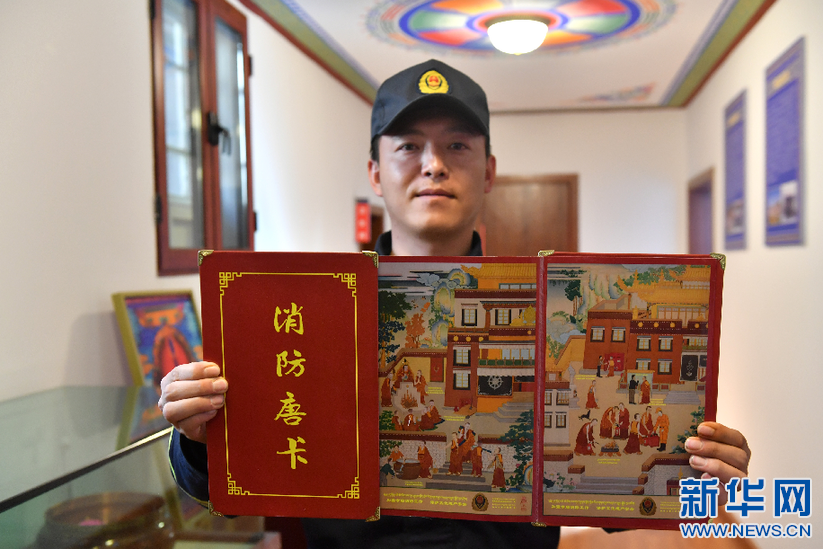 布達拉宮消防救援大隊二級指揮員喬宣茜展示消防救援大隊推出的消防宣傳唐卡(3月4日攝)。新華社記者 孫瑞博 攝