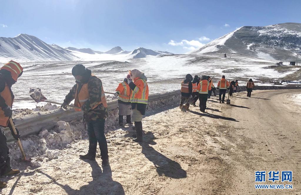 在國(guó)道109線K3351路段,安多公路養(yǎng)護(hù)段工作人員進(jìn)行除雪除冰作業(yè)(2020年3月11日攝)。新華社發(fā)(后耀軍 攝)