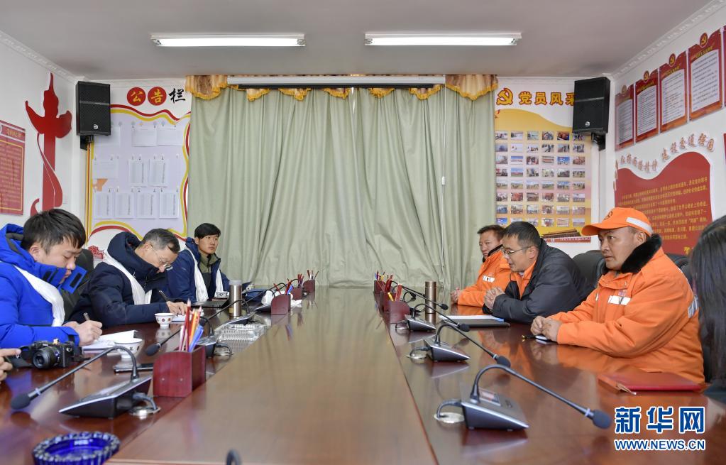 在安多公路養(yǎng)護(hù)段辦公室,扎西次仁(右一)和同事接受新華社記者采訪(1月13日攝)。新華社記者 張汝鋒 攝