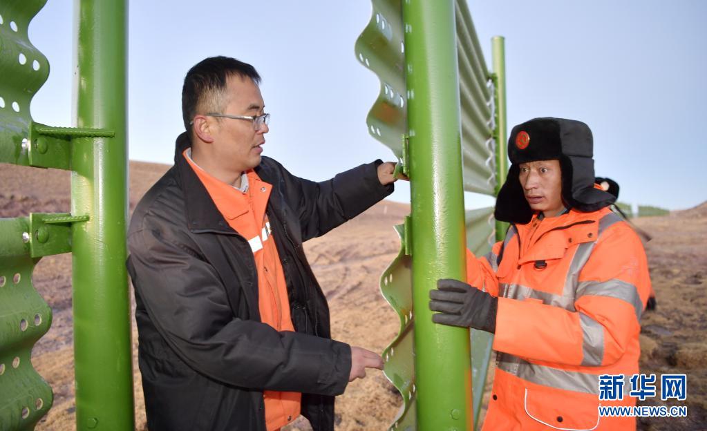 在國(guó)道109唐古拉山口處,安多公路養(yǎng)護(hù)段工作人員檢查山口的擋雪板(1月13日攝)。新華社記者 張汝鋒 攝