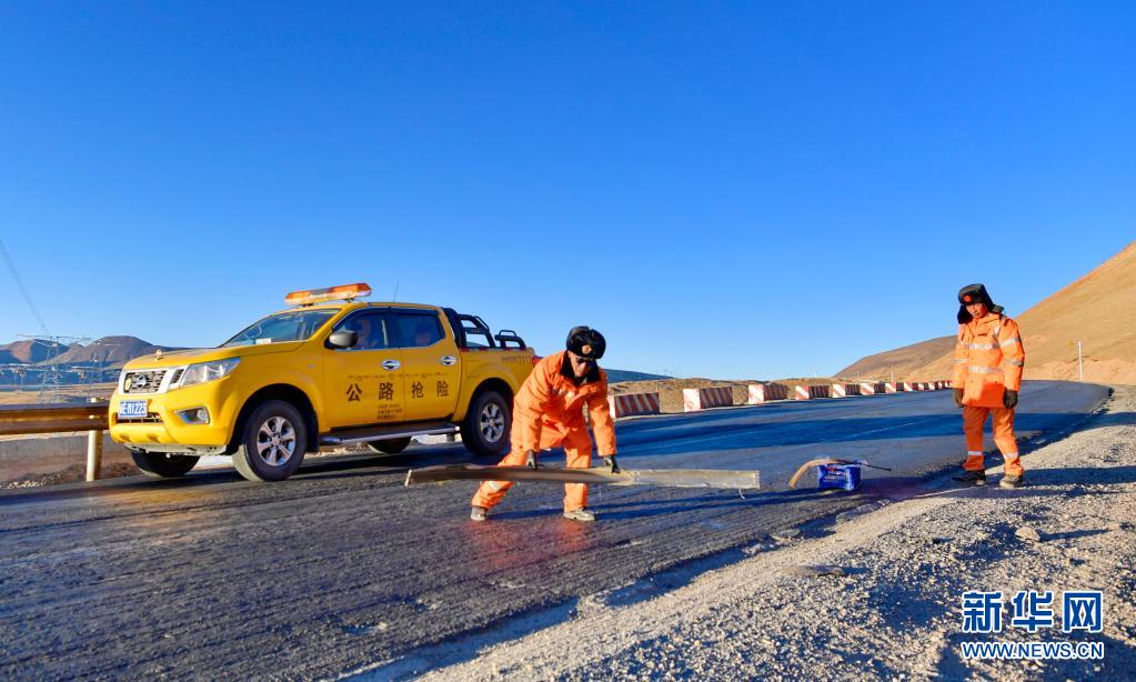 安多公路養(yǎng)護(hù)段工作人員在清理國(guó)道109上的垃圾(1月13日攝)。新華社記者 張汝鋒 攝