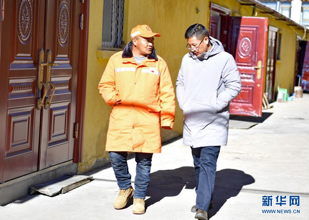 在安多公路養(yǎng)護(hù)段家屬院,扎西次仁(左)和來(lái)訪的客人交流(1月13日攝)。新華社記者 張汝鋒 攝
