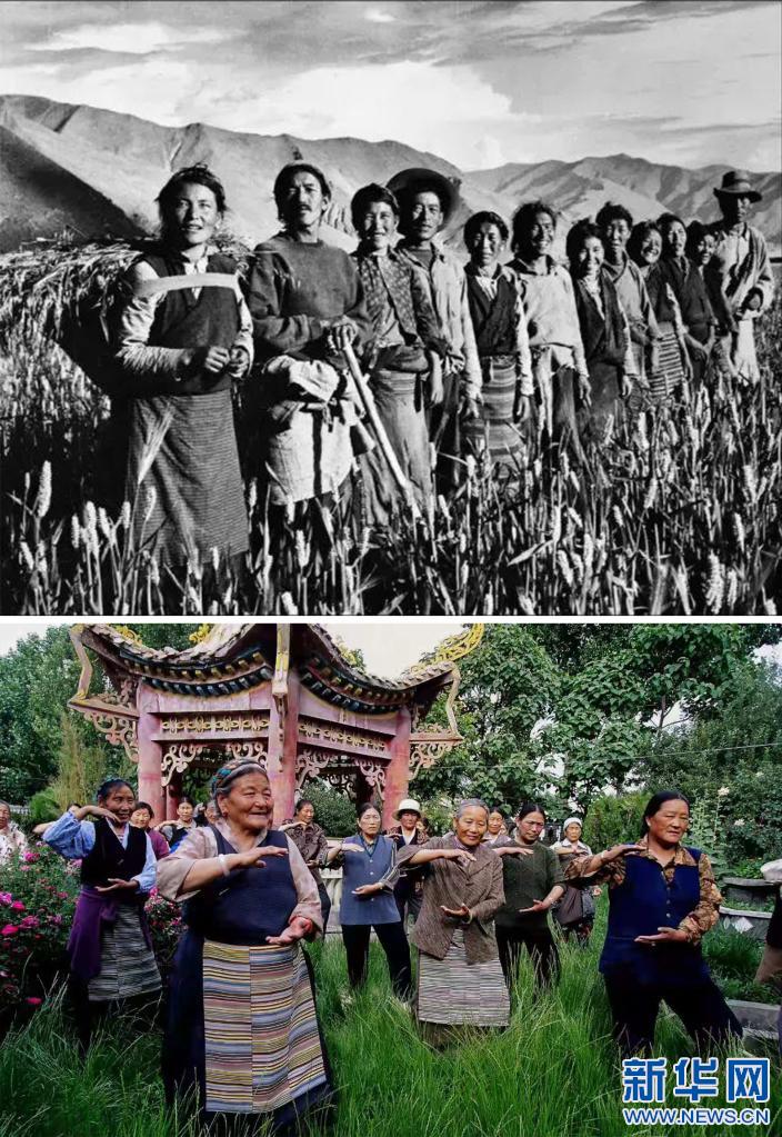 拼版照片:上圖:次仁拉姆(左一)和互助組成員在田間勞作(資料照片)。下圖:次仁拉姆(左前)在社區(qū)居委會里學(xué)習(xí)太極拳(新華社發(fā) 車剛 攝)新華社發(fā)