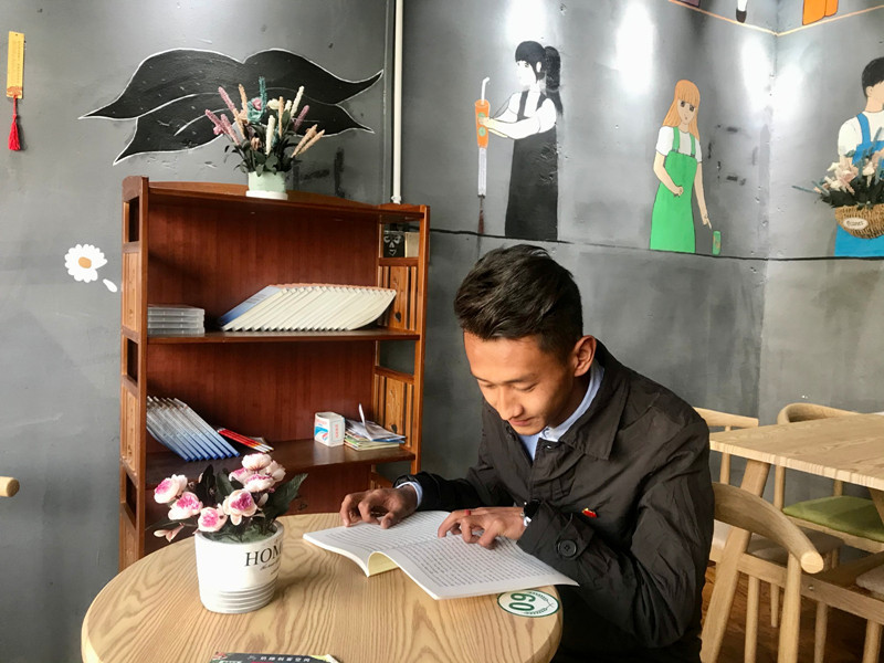 圖為創(chuàng)業(yè)者旺久利用閑暇時間看書。尼瑪次仁 攝
