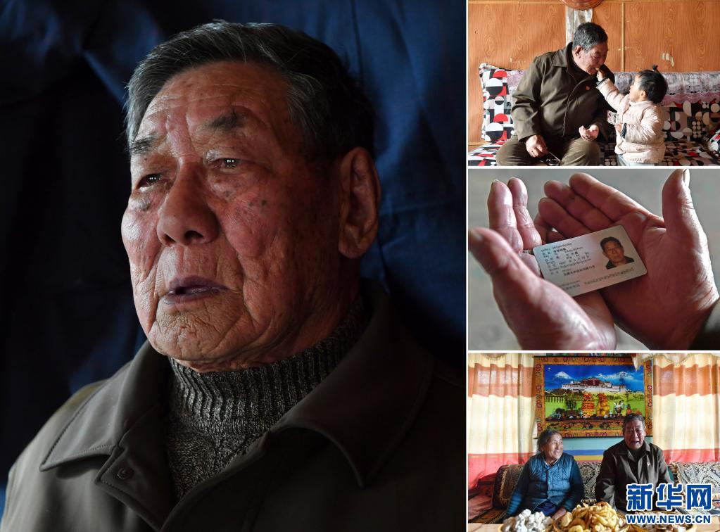 這是一張拼版照片,左圖為多扎木的肖像(3月20日新華社記者張汝鋒攝);右上圖為多扎木和兒子準備坐車外出(3月20日新華社記者孫瑞博攝);右中圖為多扎木老人的身份證(3月20日新華社記者孫瑞博攝);右下圖為多扎木(中)和兒子、兒媳在家中(3月20日新華社記者張汝鋒攝)。新華社發(fā)