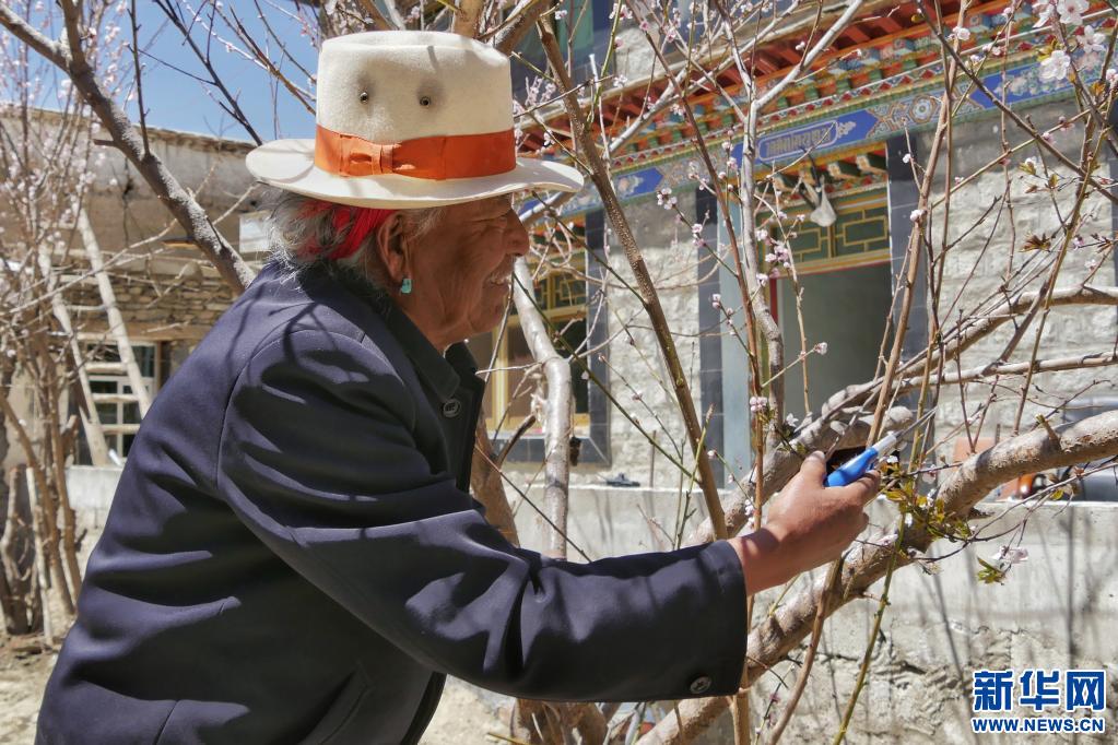 頓珠旺杰在修剪家里的桃樹樹枝(4月5日攝)。新華社記者 孫陽 攝