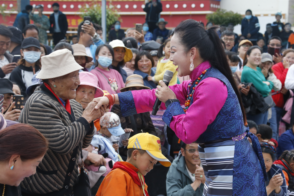 在下鄉(xiāng)途中,德西美朵不僅給群眾演唱,而且還積極向當地老百姓學習民歌。她說:“我希望可以通過我的演繹讓更多人聽到西藏群眾的聲音?!?/p>