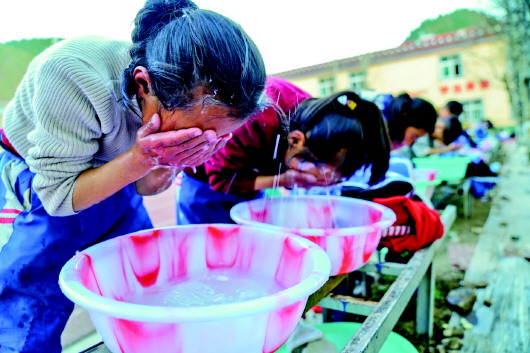 4月30日,在類烏齊縣桑多鎮(zhèn)第二小學(xué),學(xué)生們用熱水洗漱。這套熱水設(shè)施由李純民發(fā)起的“齊興”助學(xué)獎(jiǎng)勵(lì)基金捐助?!∮浾邉⒔鸷!ⅫS臻攝