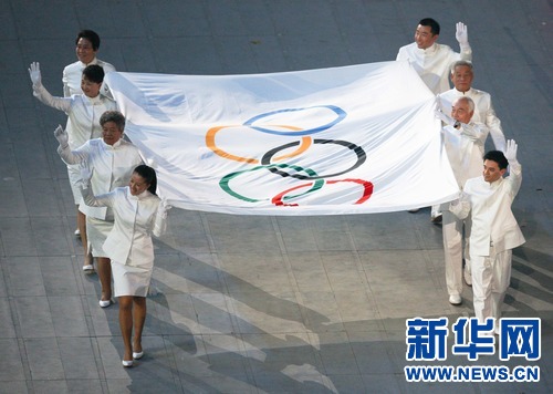 2008年8月8日,中國(guó)首位珠峰北坡登頂?shù)呐巧郊遗硕啵ㄗ筮厪那皵?shù)第二位)在北京奧運(yùn)會(huì)開幕式上,手執(zhí)奧林匹克會(huì)旗入場(chǎng)。新華社發(fā)