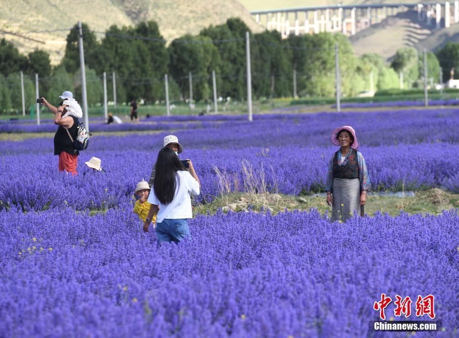 6月25日,位于西藏自治區(qū)拉薩市達(dá)孜區(qū)新倉村貝拉莊園的100畝薰衣草花海競相綻放,吸引不少游客和當(dāng)?shù)厥忻袂皝碛瓮妗⑴恼?。中新社記?貢嘎來松 攝