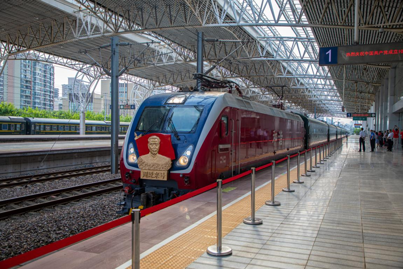 紅色旅游列車駛?cè)胝九_。