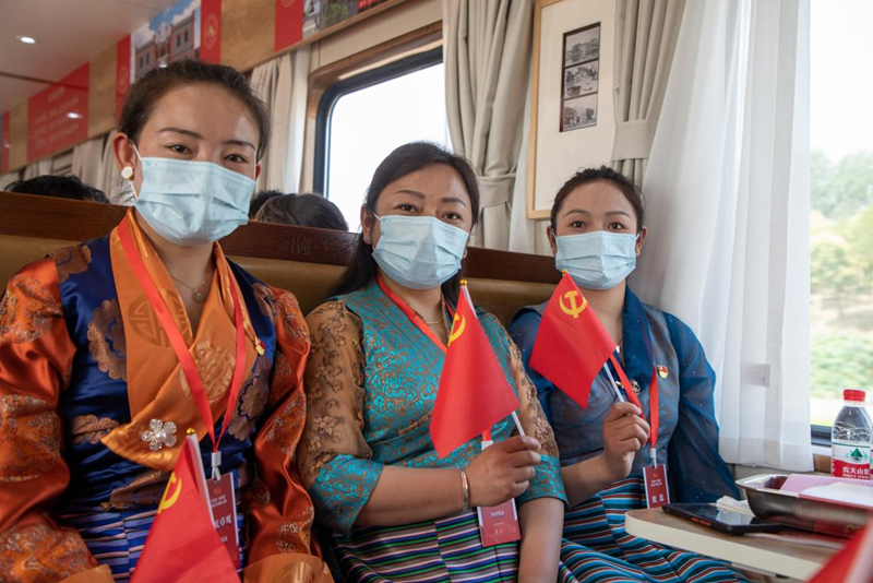 “五星紅旗迎風飄揚,勝利歌聲多么響亮!歌唱我們親愛的祖國,從今走向繁榮富強……“代表團成員才旺金美引領(lǐng)大家唱起《歌唱祖國》,雄厚嘹亮的歌聲飄蕩在車廂里。專列上,每個車廂、每個團隊都有自己的主題活動,那曲市色尼區(qū)代表團以講一段故事、學(xué)一節(jié)黨史、唱一首紅歌追溯紅色記憶,重溫黨的光輝歷程。