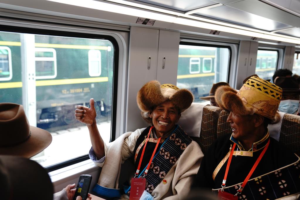 6月25日,群眾代表乘坐拉林鐵路動(dòng)車組首發(fā)車。新華社記者 劉洪明 攝