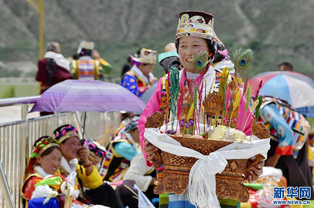 7月9日,共康村村民端著切瑪盒慶祝“望果節(jié)”。新華社記者 張汝鋒 攝