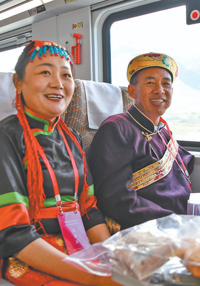 6月25日10時30分,一輛復(fù)興號高原內(nèi)電雙源動車組駛出拉薩火車站,駛向林芝市。圖為乘坐復(fù)興號的乘客。新華社記者 晉美多吉攝