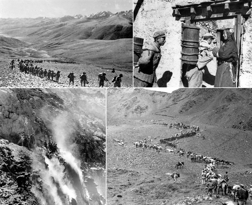 左上圖為1950年,人民解放軍戰(zhàn)士跋涉在高山峻嶺間向西藏前進(資料照片);右上圖為人民解放軍戰(zhàn)士在執(zhí)勤空隙為藏族老百姓背水(資料照片,張正模攝);左下圖為筑路戰(zhàn)士在懸崖絕壁上修建川藏公路(資料照片);右下圖為1951年7月,解放軍第十八軍進藏先遣部隊行進在瓦合山上(新華社記者袁克忠攝)。