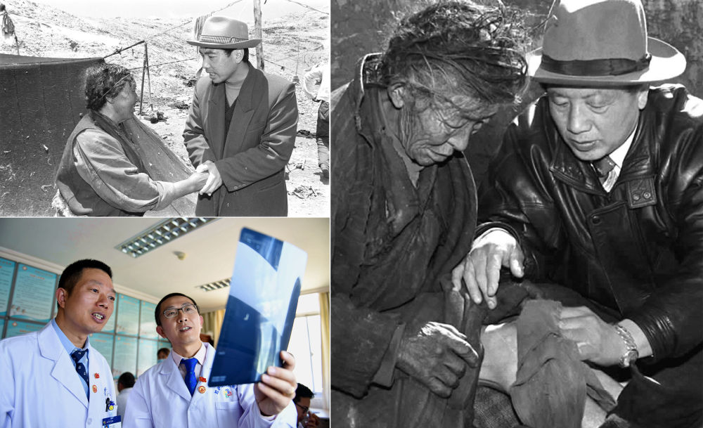 左上圖為來自陜西的援藏干部、阿里日土縣副縣長賈冗勇深入牧區(qū),幫助藏族牧民解決生產(chǎn)、生活的實際困難(新華社記者土登攝,1997年11月11日發(fā));左下圖為2017年8月3日,北京積水潭醫(yī)院援藏醫(yī)生龔曉峰(右)和北京天壇醫(yī)院援藏醫(yī)生李家謀在拉薩市人民醫(yī)院骨科病房內(nèi)查看患者的X光片,進行工作交接(新華社記者晉美多吉攝);右圖為孔繁森(右)在阿里日土縣過巴鄉(xiāng)為孤寡老人益西卓瑪治病(新華社記者土登攝,1994年12月26日發(fā))。