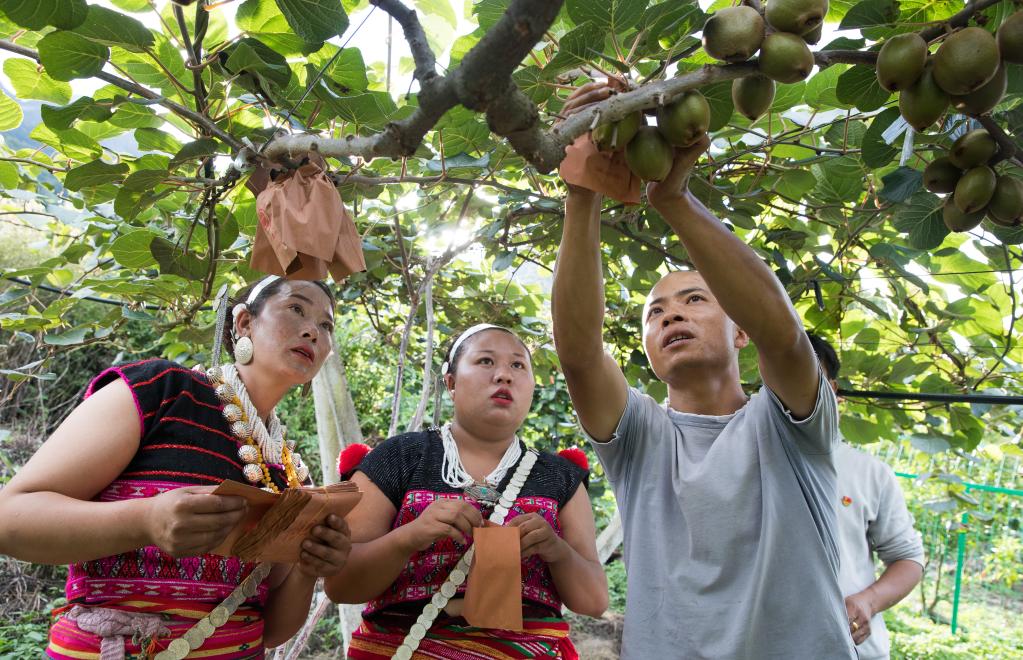 在察隅縣下察隅鎮(zhèn)京都村,管理員高峰(右)在指導(dǎo)當(dāng)?shù)卮迕窠o獼猴桃果實(shí)套紙袋(2012年7月22日攝)。 新華社記者金立旺 攝