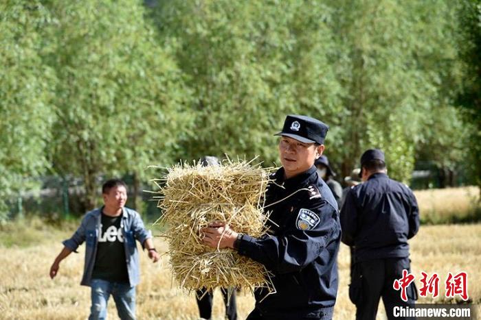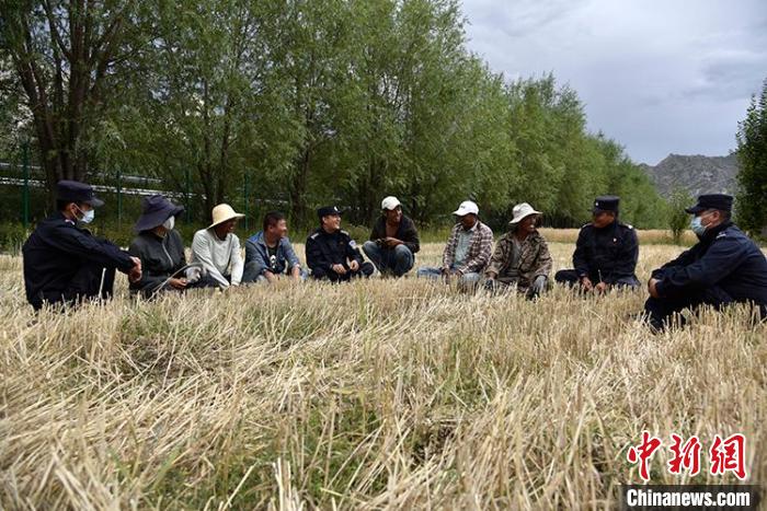 一陣忙碌過后,大家圍攏在田里聊變化說發(fā)展。慶祝西藏和平解放70周年大會剛剛舉行,大家聊著現(xiàn)場觀禮、收聽收看的感受。參加現(xiàn)場大會的民警高揚向大家分享現(xiàn)場感受,講述自己在西藏生活學(xué)習(xí)工作22年的發(fā)展變化和入警初心。歡聲笑語過后,大家又忙碌起來。田間地頭藏青藍(lán)的身影,與金黃麥地構(gòu)成一幅加強民族團(tuán)結(jié)、警民魚水情深的動人畫卷。