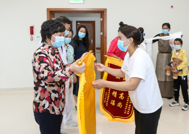 鄧?yán)蚋敝魅我恍锌赐藖碛逯委煹?5位患兒,并為他們送上嶄新的書包和文具。并與患兒家長熱情交談,詳細(xì)了解患兒恢復(fù)情況?;純杭覍俅碜楷敽屯贩謩e向重慶市衛(wèi)健委和重醫(yī)附屬兒童醫(yī)院贈送了錦旗,并獻(xiàn)上了潔白的哈達(dá)表示感謝。