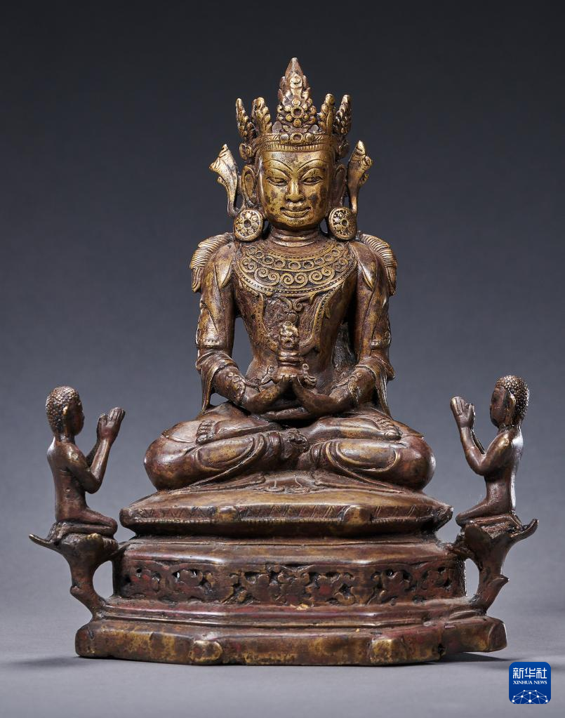 明末清初黃銅同侍從無(wú)量壽佛造像(資料照片)。新華社發(fā)
