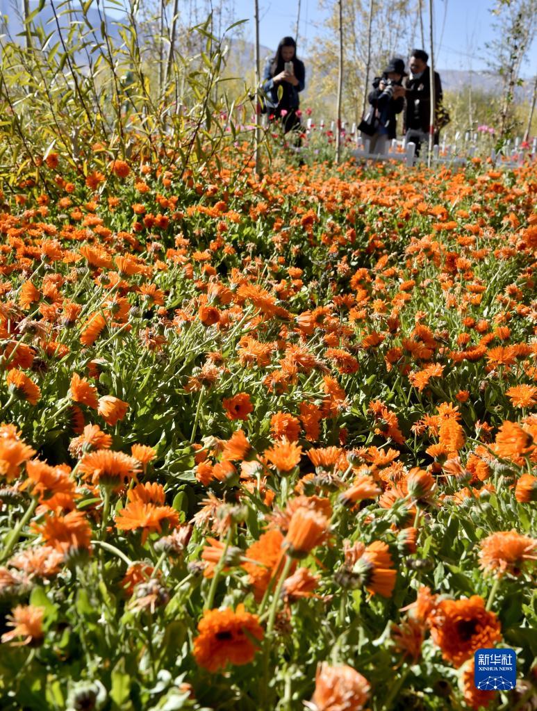 西藏阿里獅泉河鎮(zhèn)居民在街頭賞花(9月25日攝)。新華社發(fā) (索朗羅布 攝)