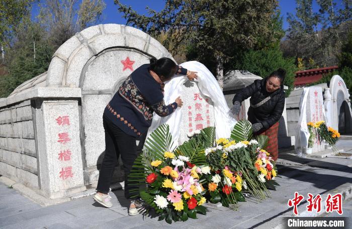 圖為9月30日,在西藏自治區(qū)拉薩市烈士陵園,群眾向孔繁森墓碑敬獻(xiàn)鮮花、哈達(dá)。貢嘎來(lái)松 攝
