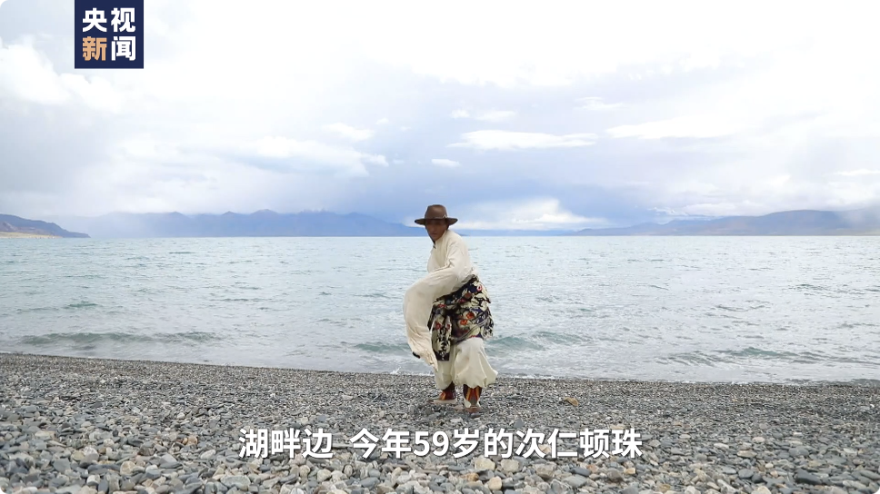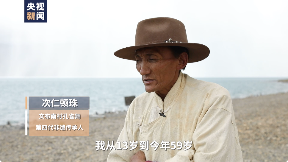湖畔邊,今年59歲的次仁頓珠,穿著傳統(tǒng)的服飾,甩起長長的白袖,跳起了從先輩那里傳承下來的孔雀舞。