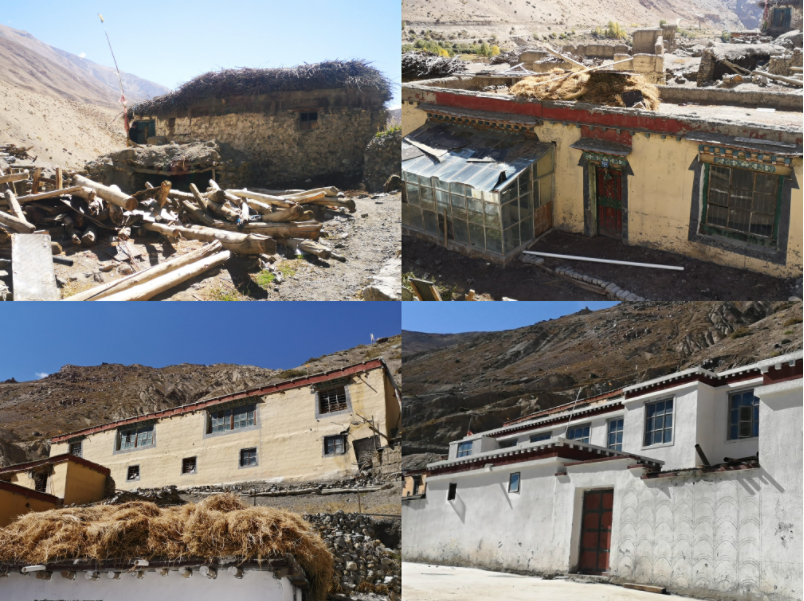 楚松村“四代房”拼圖。左上圖的土坯房是“第一代”,右上圖的土木房是“第二代”,“第三代”是左下圖的磚石房,右下圖是嶄新的兩層獨(dú)家院落,為“第四代”。新華社記者 董琳娜 攝