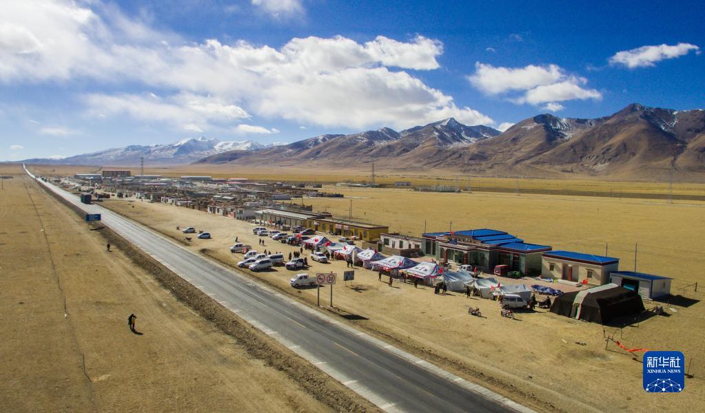 這是在青藏公路旁搭建的那曲縣香茂鄉(xiāng)畜產(chǎn)品展銷會(huì)(2017年11月25日攝,無人機(jī)照片)。新華社記者 劉東君 攝