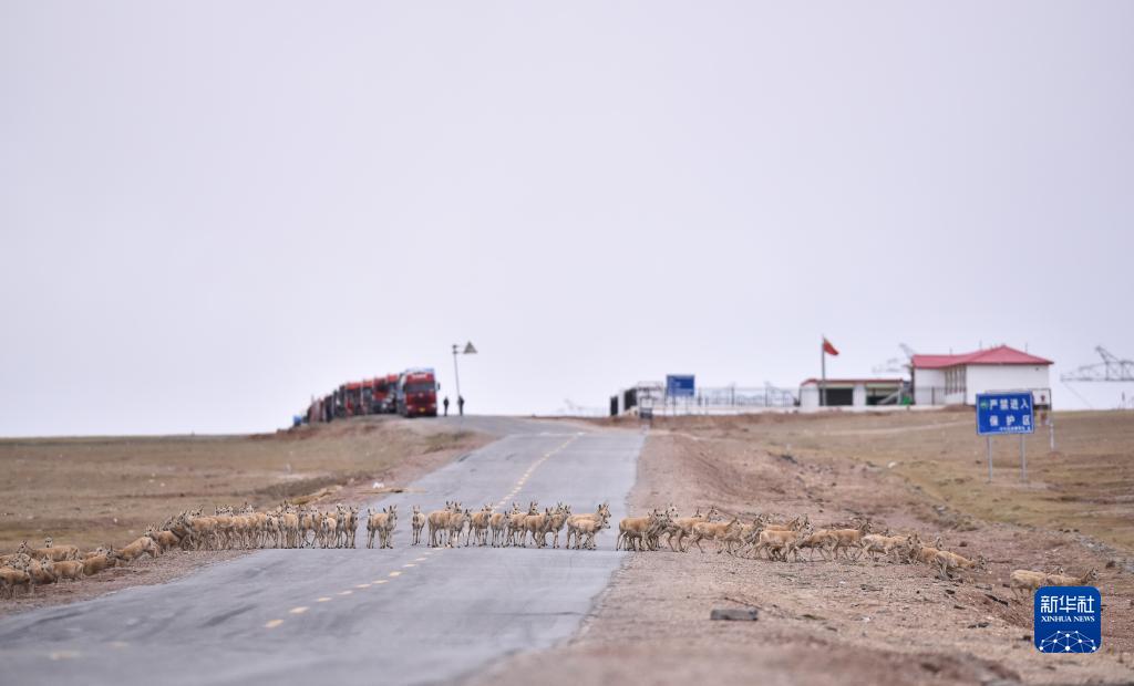 在青??煽晌骼?,一群雌性待產(chǎn)藏羚羊正在通過青藏公路(2016年6月7日攝)。新華社記者 吳剛 攝