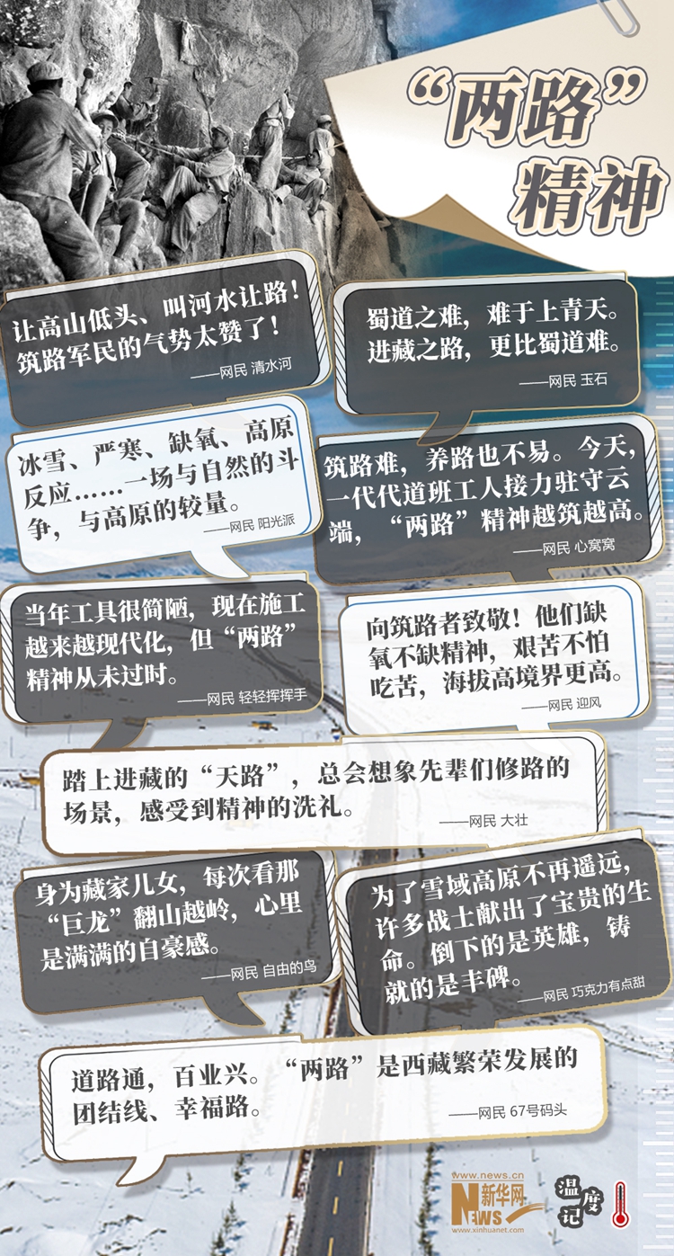 “天路”巍峨,精神閃光。當(dāng)雪域高原換了人間,新一代建設(shè)者正接過接力棒,在新時(shí)代續(xù)寫著新的傳奇?!敖裉欤淮腊喙と私恿︸v守云端,‘兩路’精神越筑越高”,正如網(wǎng)民所說,無論過去、現(xiàn)在和將來,“兩路”精神都是西藏各族人民建設(shè)幸福家園的力量源泉和精神動(dòng)力,也必將激勵(lì)中華兒女為了更加美好的明天繼續(xù)奮斗、前行。(文字:馬若虎 海報(bào)設(shè)計(jì):王曄)
